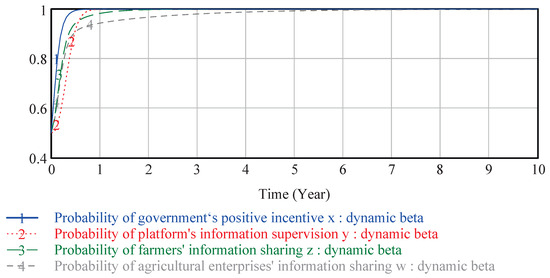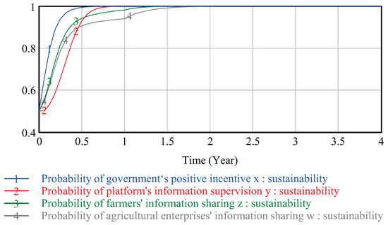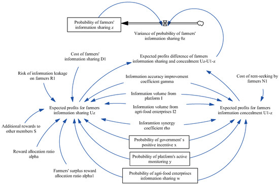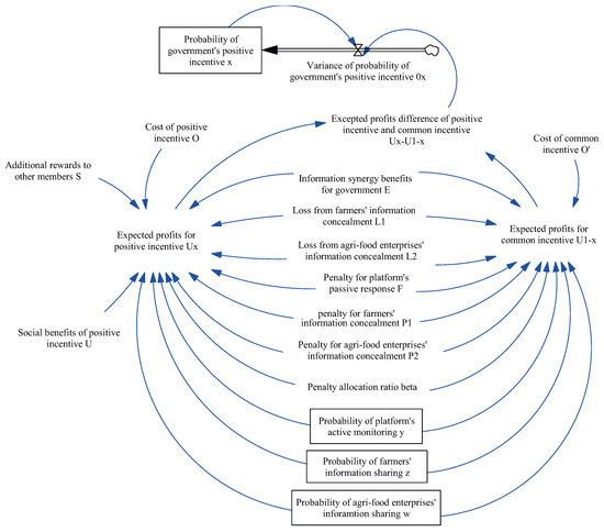 System dynamics (SD) is a quantitative modeling and simulation method designed for complex socio-economic systems. By constructing causal feedback mechanisms and stock-flow topologies, SD effectively analyzes the multi-dimensional dynamic coupling relationships and strategy diffusion paths among multiple agents [63,64]. Leveraging the Vensim simulation environment, this method enables parameter sensitivity analysis, strategy evolution tracking, and system stability testing, providing a methodological foundation for the dynamic simulation of multi-agent collaboration systems [65,66]. In this study, an AFSC information collaboration quadripartite evolutionary game system is developed based on SD modeling. This framework systematically illustrates the interactions and non-linear dependencies among the four game agents, facilitating quantitative analysis of their strategic decision-making pathways through simulation. Additionally, the SD model allows for an in-depth examination of the impact of various variables on strategic behaviors. This section focuses on analyzing the equilibrium convergence characteristics of the information collaboration system under different government incentive strategies, offering decision-support solutions for digitally empowered AFSC governance.