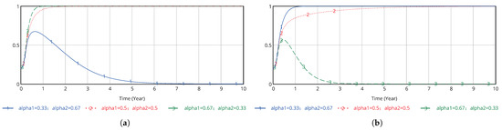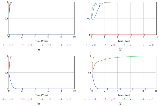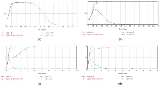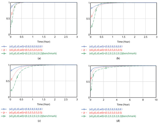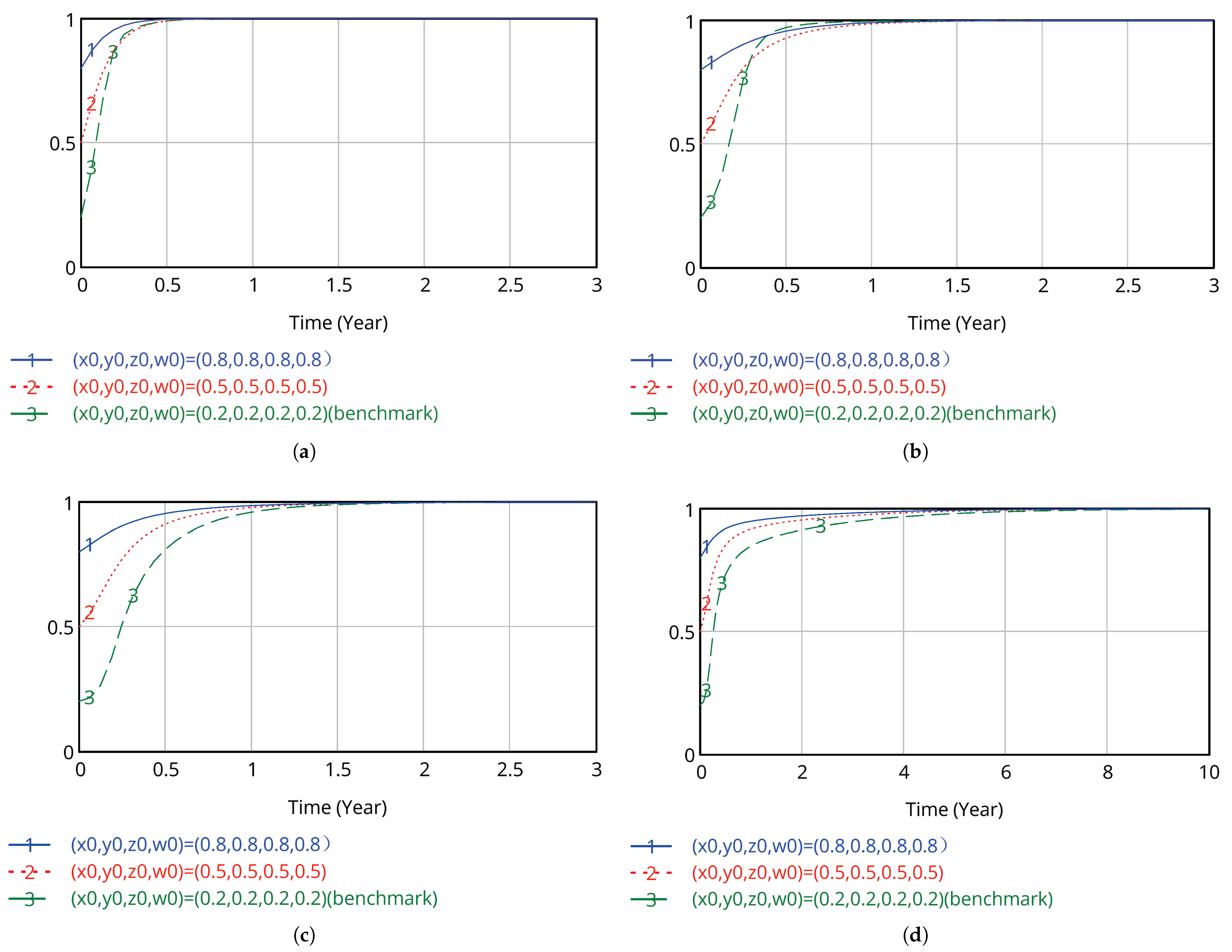 (2) The initial strategy combinations significantly affect convergence. In the early policy stages, low enthusiasm among non-government agents weakens system stability. The government should enhance participation confidence and adjust the incentive strategies to accelerate convergence—especially for AFEs, whose strategic evolution is notably slow.