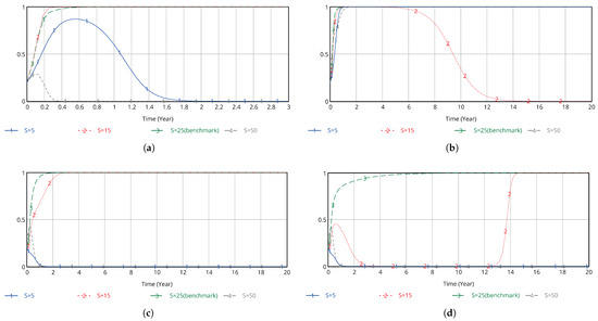 (3) The simulation results show that the reward amount S is a sensitive parameter: moderate levels sustain collaboration, while overly high or low values destabilize the system. The government must carefully calibrate the reward levels to offset sharing risks without creating fiscal overdependence.