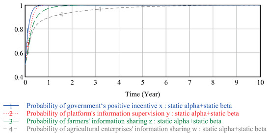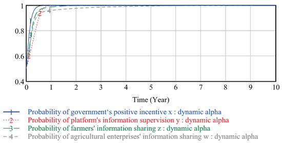 The parameter setting for the information collaboration benefits part refers to the study [51], with benefits measured by the volume of information obtained by each agency. The ISP remains in an information sharing state, with its published public information volume recorded as I, while the information volumes shared by farmers and AFEs are recorded as and , respectively. When both farmers and AFEs choose information sharing strategies, they trigger an “information synergy effect”, with a synergy coefficient , allowing each agency to obtain additional synergistic benefits: the ISP gains , farmers gain , AFEs gain , and the government receives additional social benefits E from the synergy.