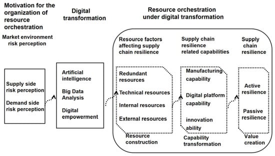 Resource orchestration theory posits that the effective coordination, allocation, utilization, and management of resources [71] are more critical than the resources themselves [12]. Digital technology has gradually become a key enabler of supply chain resilience by reshaping organizational structures and supply chains [60]. Prior studies examined how digital transformation influences supply chain resilience from a resource-based perspective, with a primary focus on its ability to transcend organizational boundaries and integrate and restructure other enterprise resources within the supply chain, which are considered fundamental to maintaining business operations. From the perspective of resource allocation, Yin categorizes digital transformation according to its breadth and depth, identifying it as a key pathway for enhancing supply chain resilience [60,67].