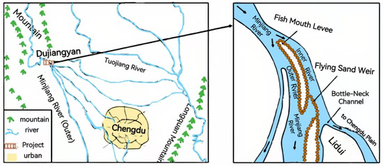 Layout of the DJY. Notes: The left part shows the location relationship between DJY and Chengdu Plain. The right part shows the main structure of the DJY; the Minjiang River is divided into the Inner River and the Outer River (typically, the ratio of water divided between the inner and outer is 40–60%), and the water of the Inner River flows to the Chengdu Plain.