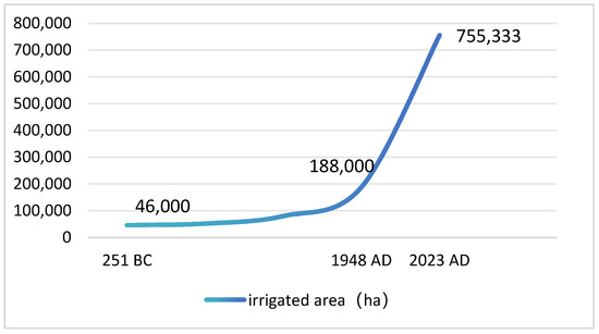 A turning point in the development of the irrigated area in DJY was identified during data analysis (Figure 2). Based on this turning point, this study considered the process of sustainable value creation in two key phases: (1) the slow value development phase (276 BC–1948) and (2) the rapid value expansion phase (1949–present).
