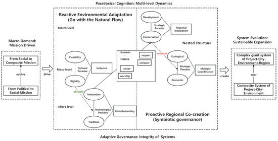 With the alleviation of the technological paradox at the micro level and the cultural paradox at the meso level, DJY has gradually transformed into a Project–City–Environment composite system. The system exhibits the open characteristics of continuation, expansion, and interdependence of environmentally friendly socio-economic, political–military, and other values.
