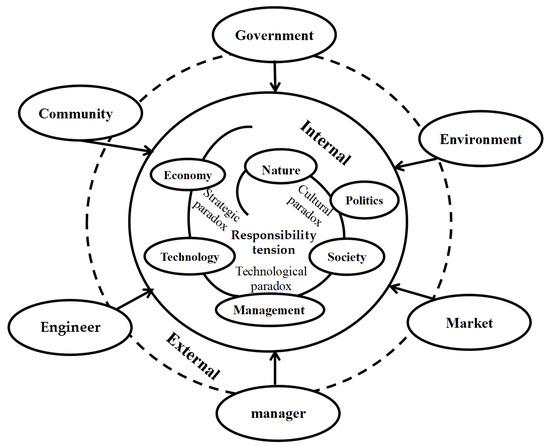 The core of the “two-force” model consists of the evolution of project paradoxes under the combined effects of six elements: nature, society, technology, politics, management, and economy. This includes the cultural paradox driven by nature, society, and politics; the technological paradox driven by society, technology, and management; and the strategic paradox driven by technology, economy, and nature. Correspondingly, the cultural paradox demonstrates the responsibility conflict between managers and the workers, i.e., the relationship between people. The technological paradox focuses on the responsibility conflict of engineers, i.e., the relationship between people and megaprojects, and the strategic paradox represents a higher level of responsibility conflict—the relationship between humans and nature. Thus, the evolutionary kernel of the megaprojects’ paradox is a change in the tension of responsibilities. For example, environmental justice, social justice, etc., have now shifted from intragenerational to intergenerational responsibilities.