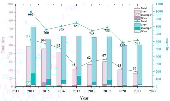 As reported by the International Chamber of Shipping, over 50,000 merchant vessels and nearly two million seafarers are currently operating worldwide. Shipping is recognized as one of the most globalized industries and, at the same time, one of the most hazardous. According to the European Maritime Safety Agency, 12,502 maritime incidents involving various types of vessels occurred between 2014 and 2022, resulting in numerous crew casualties, as shown in Figure 1. Maritime accidents have profound consequences for human lives, property, and the environment [1]. Notably, the “human element”, often referred to as “human error” or the “human factor”, is widely recognized as the leading cause of marine casualties. The complexity of the global maritime environment means that even minor human errors can escalate into major accidents.