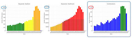 The search strategy involved using a combination of keywords such as “seafarer”, “crew”, “mariner”, and “sailor” alongside terms like “human health”, “healthcare”, and “well-being”. Analysis of publication trends indicates that the number of articles related to these keywords and their combinations has been annually increasing. While a significant volume of papers exists in the categories of seafarers (or crew, mariners, sailors) and healthcare (or human health, well-being), the intersection of these two fields (seafarers’ healthcare) has fewer publications. Moreover, there is no comprehensive article addressing the technologies underlying a seafarers’ healthcare system, as illustrated in Figure 2.