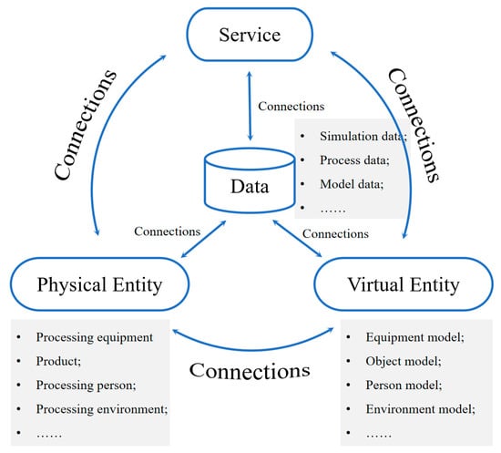 A DT system consists of five subsystems: physical objects (or physical entities), virtual models (or virtual entities), connections, data, and service systems. The relationships among these subsystems are shown in Figure 5. DTs provide a unique capability for digitally representing physical entities [18,19]. Using sensory data acquisition and advanced big data analysis, DTs are highly effective for monitoring, diagnostics, prognostics, and optimization [20,21]. Once connected with digital representations of facilities, environments, and individuals, DTs support decision-making by assessing current conditions, diagnosing past issues, and predicting future trends [22].