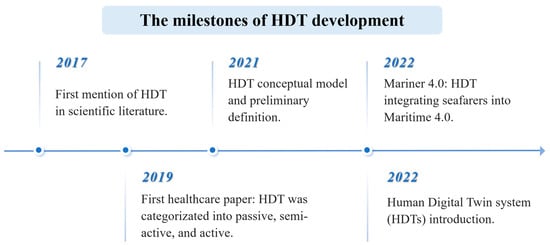 Human Digital Twin (HDT) is referred to when the physical entity in a DT is shifted from inanimate assets to humans. Figure 6 depicts the evolution of HDT. First proposed by Graessler and Poehler [23], HDT initially referred to simulating human attributes and behaviors in cyber–physical production systems. Later, Chakshu et al. categorized HDTs into three types (passive, semi-active, and active) and introduced the concept to healthcare [24]. However, the conceptual model of HDT was not clarified until 2021, when Shengli and Naudet et al. defined it as “a real-time mirroring computerized system of a human agent [25,26,27], able to simulate or emulate their characteristics and behavior in context”. In 2022, Taylor et al. integrated HDT into Maritime 4.0, specifically focusing on seafarers [28].