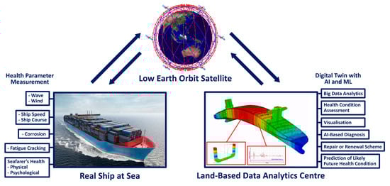 One such solution is the concept of Digital Healthcare Engineering (DHE), introduced by Paik [10,11], which aims to address these challenges. The DHE framework has been explored for enhancing the safety and sustainability of aging ships and offshore structures [12] as well as subsea pipelines [13]. The system focuses on real-time health monitoring by collecting on-site data and performing detailed analytics and simulations at land-based centers, leveraging Digital Twin (DT) technology. Communication between ships, offshore installations, and land-based centers is enabled through low Earth orbit (LEO) satellites.