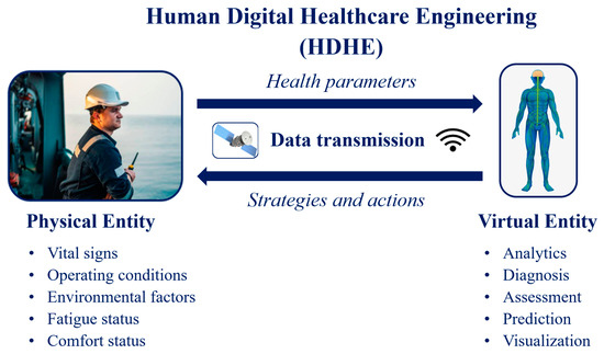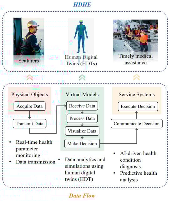 In addition, the Human Digital Twin (HDT)—a derivative of DT technology applied to human bodies—is expected to be integrated into the maritime sector. HDT enables real-time monitoring of crew members’ health and well-being, ultimately improving the reliability of human operations [14,15].