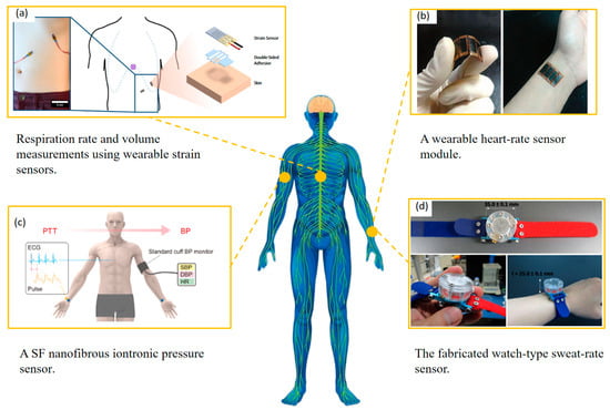 In recent years, wearable sensors have become a significant focus for monitoring various health parameters, including heart rate [29,30], body temperature [31], blood pressure [32,33], respiration rate [34], and sweat rate [35]. Equipped with the ability to capture accurate sensory data in real time, these sensors provide valuable insights into the physical health of crew members. Practical applications of wearable sensing technologies are shown in Figure 10.