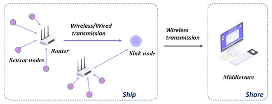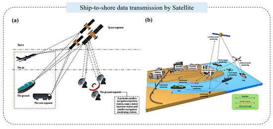 Ship-to-shore communication is crucial for relaying HDHE system data to onshore centers. Satellite communication systems, such as the BeiDou Satellite Navigation Sensor System (BDS) [47] and frameworks like the Ship Emission Monitoring Sensor Web (SEMSW) [48], are commonly used for this purpose. Figure 13a,b shows two typical satellite-based communication architectures. The left panel depicts a standard system involving vessels, satellites, and ground stations. The right panel illustrates an applied framework where ships transmit data via satellites to shore-based centers, enabling remote health monitoring and operational coordination. The gradual reduction in satellite communication costs has led to its widespread adoption in maritime industries.
