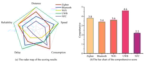 Wireless transmission technologies provide a practical alternative, with methods such as Zigbee, Bluetooth, Wi-Fi, Ultra-Wideband (UWB), and Near-Field Communication (NFC) offering diverse applications. Each method has distinct benefits and drawbacks, with evaluation results based on criteria such as distance, speed, power consumption, delay, and reliability shown in Figure 12.