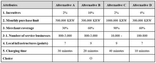 This study analyzed consumer preferences for local currency systems. To predict consumer demand for local currency, we employed a conditional logit model using data from a choice experiment, which included analyzing consumers’ stated preferences (SPs) and estimating the utility value associated with each attribute. Choice experiments have been widely used as an effective method for predicting the probability of consumers selecting specific products and services [28,29,30,31,32].