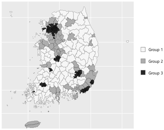Group 1, represented by the lightest section of the map, includes most small towns. Group 2, shown in gray, consists of satellite cities near metropolitan areas. Group 3, depicted in the darkest shade, comprises districts within major metropolitan cities.