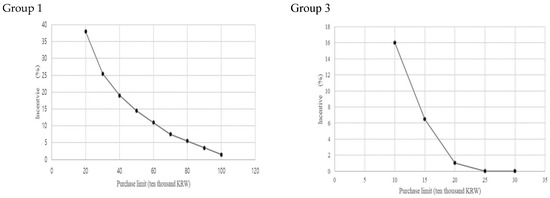 Based on Equations (4) and (5), consumers’ utilization decreases if the government’s budget decreases due to the maximum purchase limit–incentive combination based on the proper issuance of local currency. Furthermore, in the small towns represented by Group 1 (Figure 2), incentives and choice probability decrease as the maximum purchase limit increases at the calculated level of appropriate issuance. In large cities, represented by Group 3 (Figure 3), the relationship between purchase limits, incentives, and choice probability appears to be the same as in small cities; however, as purchases increase, incentives decrease dramatically.
