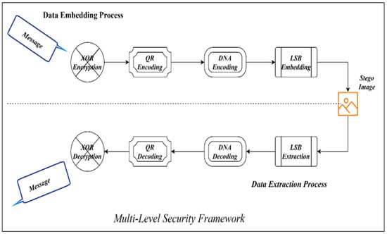 This section outlines a multi-step framework designed to enhance data security. This is ensured through a combination of cryptographic techniques and steganography. We employ symmetric encryption, error-correcting codes, and secure data-embedding processes. This is performed to ensure the suitability of high-security communications. Initially, the data are encrypted using an XOR operation with a pseudo-random key stream generated by a chaotic function, which enhances unpredictability. The encrypted data are then turned into a QR code, which has intrinsic error correction capabilities. The QR code is further encoded into a DNA sequence, adding intricacy and protecting against unauthorized access. Finally, the DNA-encoded message is placed within an image using least significant bit (LSB) steganography, which keeps the cover image visually intact while hiding the encrypted data. This multi-layered approach enhances resilience against various cryptographic attacks while ensuring high confidentiality, making it ideal for secure communication systems. The following subsections detail this strategy, which integrates expertise from different areas to provide a comprehensive and efficient data security solution. Figure 1 depicts the architecture.