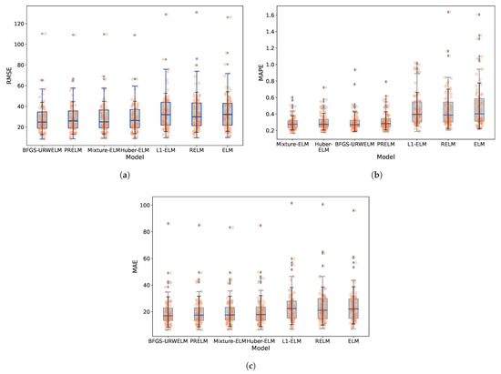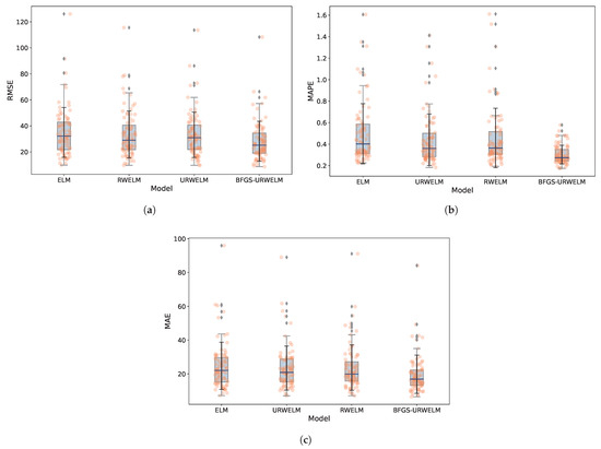 Table 6 shows that the baseline ELM model had the highest error rates with an RMSE of 35.38, an MAPE of 0.4621, and an MAE of 24.79. Simple regularization approaches in the RELM and L1-ELM yielded only marginal improvements. In contrast, the Huber-ELM significantly reduced the errors with an RMSE of 29.26, an MAPE of 0.3069, and an MAE of 20.44, while the mixture ELM and PRELM were further enhanced in terms of performance; the mixture ELM achieved the lowest MAPE at 0.2920. Notably, the BFGS-URWELM achieved the lowest RMSE at 28.34 and the lowest MAE at 19.76, indicating superior overall error control. These findings underscore the benefits of integrating advanced optimization techniques and robust loss functions to improve predictive accuracy and stability in ELM-based models.