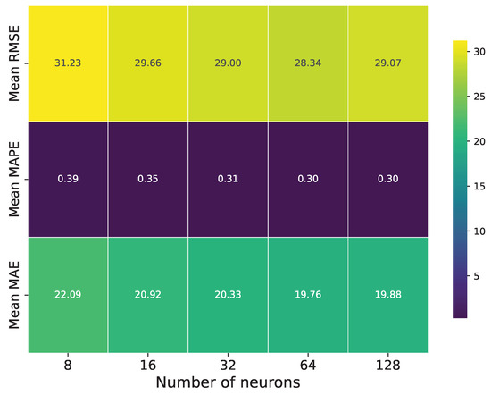 In order to analyze the sensitivity of the BFGS-URWELM, the number of neurons was set to 8, 16, 32, 64, and 128. The performance with different numbers of neurons is shown in Figure 3. The results indicate that increasing the number of neurons enhanced the model’s fitting performance up to an optimal point. The RMSE decreased from the configuration with 8 neurons, reaching its lowest value at 64 neurons with a value of approximately 28.34 and then slightly increasing at 128 neurons to about 29.07. The MAPE showed a significant reduction from 0.39 with 8 neurons to 0.30 with 64 neurons, and it remained constant at 0.30 with 128 neurons. The MAE followed a similar trend, decreasing to a minimum of 19.76 at 64 neurons and then marginally rising to 19.88 at 128 neurons. Therefore, 64 neurons represent an optimal balance that achieves the best or near-best performance across all evaluation metrics while mitigating the potential overfitting and optimization instability associated with higher neuron counts.
