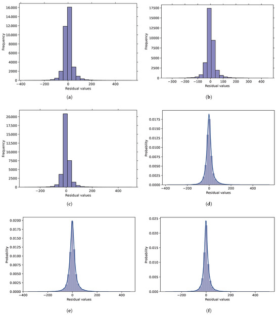 To further analyze the performance of the BFGS-URWELM, the residuals of the ELM, URWELM, and BFGS-URWELM algorithms were analyzed. Figure 4 illustrates the probability density plots and histograms of the prediction residuals of the ELM, URWELM, and BFGS-URWELM algorithms.