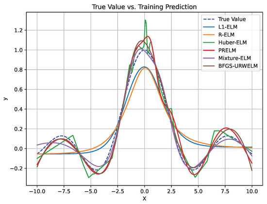 For the mixed noise scenario, the noise was generated using a combination of different distributions: 80% was drawn from the Gaussian distribution , and 20% originated from the Laplace distribution . To better analyze the performance of the BFGS-URWELM, it was compared with the original ELM and some variants of the ELM algorithm, such as the Lasso-ELM (LELM), Ridge-ELM (RELM), ELM with Huber loss function (Huber-ELM), PRELM [28] and mixture ELM [25]. Figure 6 shows the performance of six different algorithms on mixed noise-contaminated training data. The specific performance is shown in Table 5.