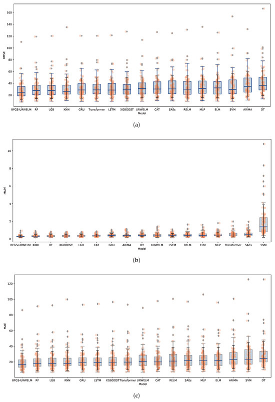 To assess the algorithm and demonstrate its ability to generalize, traffic flow predictions were made for 80 different subway stations. The training dataset included data from the initial 22 days of every dataset, with the 23rd and 24th days set aside for model testing. The BFGS-URWELM’s performance was measured against several popular traffic flow models like ARIMA [29], Multilayer Perceptron (MLP) [30], K-nearest neighbor (KNN) [31], decision tree (DT) [32], and SVM [33]. Ensemble learning models included the XGBoost [34], Catboost [35], LGB [36], and random forest algorithm (RF) [37]. The Python 3.7 was used. The scikit-learn [38] library was used for machine learning algorithms to implement the baseline model, and the parameters used the recommended default parameters. In addition, deep learning-based models were incorporated into the comparison to better reflect the current state of the art. These include Stacked Autoencoders (SAEs) [39], long short-term memory networks (LSTMs) [40], Gated Recurrent Units (GRUs) [41], and the Transformer [42], all of which have demonstrated strong performance in time series forecasting and sequence modeling tasks. The performance of the BFGS-URWELM, along with MLP, DT, XGBoost, SVM, RF, etc., was examined in terms of the RMSE, MAPE, and MAE results, as depicted in Figure 8.