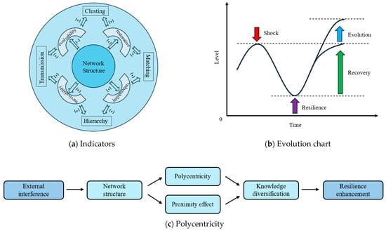 Schematic diagram of network structural resilience. (a) Indicators. (b) Evolution chart. (c) Polycentricity.