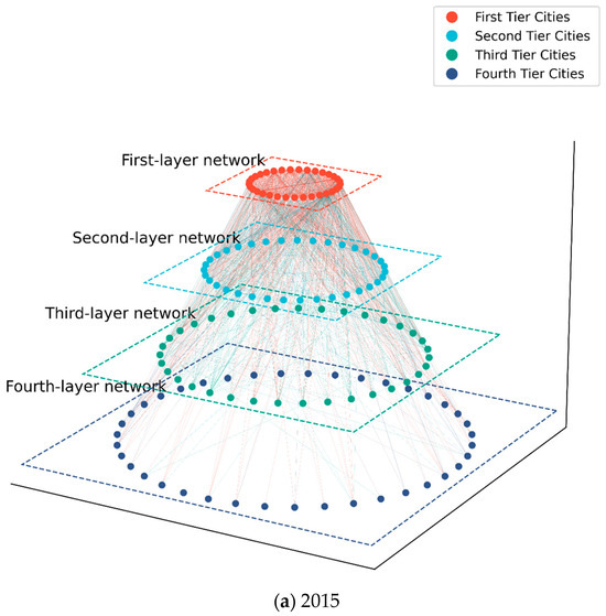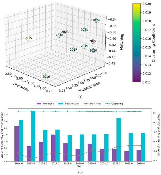 The 3D scatter plot in Figure 7a systematically visualizes the temporal evolution of three network metrics—hierarchy, transmission, and matching—from 2015 to 2024. Each data point, labeled with its respective year, occupies a position in the 3D space defined by these axes, while its color intensity (gradient: deep purple to bright yellow) quantitatively represents the clustering value, with darker hues indicating lower coefficients (e.g., 2022 at 0.011) and lighter tones denoting higher values (e.g., 2015 at 0.020).
