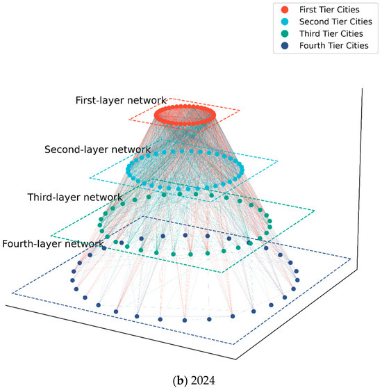 Network resilience to external shocks and internal node failures has emerged as a critical indicator of sustainability. Studies reveal that a center-edge structure, overly reliant on a few core nodes, is susceptible to systemic risks. In contrast, redundant connections and decentralized layouts significantly enhance network resilience [16,17,18]. For instance, the COVID-19 pandemic and supply chain crises highlighted the vulnerabilities of single-connectivity models, while cities with multi-channel connectivity and local innovation capabilities demonstrated greater resilience [19,20,21,22]. Consequently, fostering multiple regional innovation centers and enhancing functional substitutability among nodes have become key strategies for optimizing network resilience. This approach must balance the functional relief of core cities with the innovation empowerment of small and medium-sized cities to prevent resource concentration-induced path dependence [23].