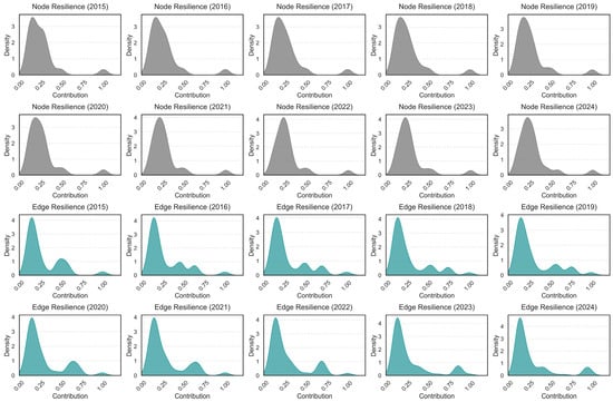 Temporal evolution of node and edge resilience: Node and edge resilience exhibited divergent trajectories from 2015 to 2024. Core cities maintained high resilience through dense innovation ecosystems, while peripheral cities stagnated or declined, amplifying polarization. Kernel density estimation revealed a long-tail distribution, with a few city pairs (e.g., Beijing–Shanghai) anchoring network robustness, whereas most edges remained fragile. The rise of regional hubs like Chengdu and Xi’an signaled incremental diversification, yet their resilience contributions paled against core cities. This duality highlights the tension between agglomeration benefits and equitable network integration, with eastern regions sustaining superior edge strength due to entrenched economic and institutional advantages [38,39].