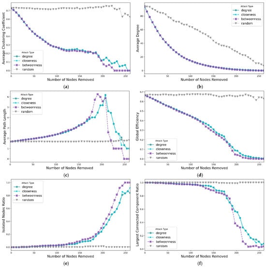 In this study, we conducted the simulation using Python (3.11.7) and its NetworkX library. After 20 min of computation, the results of 2024 were obtained, as summarized in Figure 8 below. Degree attacks represent connectivity loss, closeness attacks represent propagation delays, and betweenness attacks represent structural splitting.