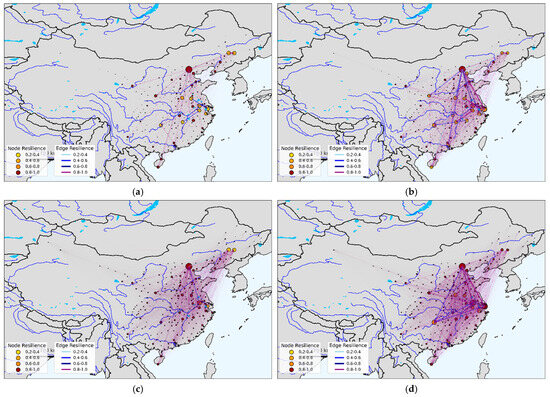 Kernel density and resilience disparities: The kernel density analysis of resilience metrics underscored extreme spatial concentration. Over 80% of nodes contributed minimally to network stability, while core cities’ resilience scores formed distinct high-density peaks. Edge resilience mirrored this pattern, with high-weight connections clustered among Tier 1 cities, creating a resilient backbone but leaving lower-tier linkages vulnerable. The persistent long-tail effect implies that disruptions to core nodes or edges—such as betweenness attacks—could trigger cascading failures. Addressing these disparities requires policies to elevate secondary cities’ innovation capacities and foster redundant connections, thereby flattening the resilience density curve [40].