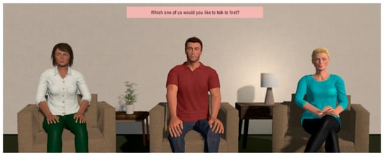 Embodied Conversational Agents (ECAs), act as digital twins (DTs) representing visually and behaviourally the human counterpart in the role they are playing. When it comes to DTs for health care, ECAs can be simulated to represent actual in-person coaching with single or multiple coaches. Gámez Díaz, Yu [] drew a connection between smart coaching and a digital twin, since both share certain characteristics, like having artificial intelligence as a core, being able to communicate in near real-time, and having the means to interact with the real world through hard or soft sensors. These digital twins are not only more accessible but, through the use of human like empathy, which aids in the development of a working alliance, ECAs have been found to improve adherence to treatment advice []. While many researchers and applications provide a single coach, we explore the value of a virtual one stop health shop where the user can talk to multiple health coaches (dietician, physical coach and cognitive coach) in the same session.