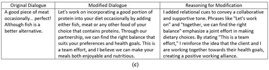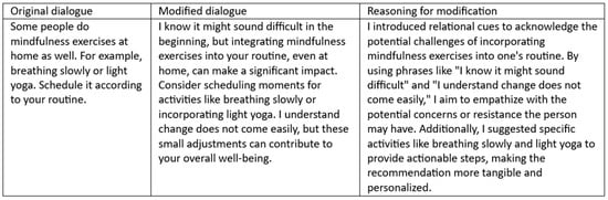 Table 2 presents examples of all the coaches’ original and modified dialogues with the reasoning that explains why ChatGPT found the modification suitable, and also shows the relational cues embedded in the modified dialogue. For example, the original dialogue “Try An amazing beets salad, with cashew nuts, small pieces of apple, and goat cheese,” has no working alliance cues, but the modified example “How about trying an amazing salad together? We can incorporate cashew nuts, small pieces of apple, and cheese for a delightful and nutritious meal. I’m here to help you with the recipe,” contains the cues “together” and “I’m here to help you with the recipe.” Reasoning also suggests that these specific relational cues are considered important and appropriate by ChatGPT for team building and for giving a sense of support to the user. Six dialogue snippets are shown as examples in Table 2. The whole generated dialogue set can be found in Appendix A.