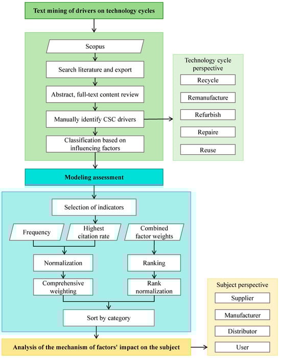 As shown in Figure 3, this paper, from a technology cycle perspective, constructs a CSC implementation path for multiple subjects through the following steps. Step 1: all the drivers of CSC are identified and categorized using text mining and analysis methods. The required data comes from related research literature. Step 2: build an assessment model to prioritize the drivers of CSC. Step 3: apply text analysis methods to identify the driving factors under different subjects, analyze the interaction mechanism between these factors and the way they affect the subjects, and accordingly propose a development path for the collaborative implementation of CSC by multiple subjects.