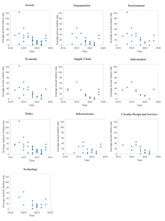 Figure 4 illustrates these 10 categories, with each dot representing a CSC driver discussed in an article. The specific location of each dot is based on the year of publication and the article’s average annual citation rate. A high frequency of discussion means that the drivers in this literature have received widespread attention in the academic community and may be considered core drivers. A high citation rate, on the other hand, indicates that this literature is authoritative and influential in the field, providing key insights into the drivers.