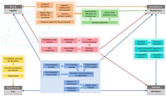 The CSC model proposed by Farooque et al. [4] identifies four key subjects (i.e., suppliers, manufacturers, distributors, and users) as described by MacArthur [3]. Based on the factors derived from the statistics and categorization in Section 4.1 and Section 4.2, the drivers were grouped into four categories by subject, as shown in Table 11. Each material flow link of CSC is directly affected by one of the ten types of drivers, focusing on the interrelationship between different subjects and drivers. Therefore, by analyzing the mechanism of each factor on the main body, the construction path for the successful implementation of CSC by different main bodies is proposed. The pathway diagram in Figure 5 clearly demonstrates how the key aspects of CSC, from raw material supply to the final consumer, are interconnected and facilitate the practice of CE through a range of strategies and practices. The four subjects studied act directly on all components of the CSC and influence value creation in general, with the practice paths of the different subjects indicated by solid lines with different representative colors. However, there are interaction mechanisms between the drivers that will indirectly influence the other subjects, as shown by the widened arrows in Figure 5.