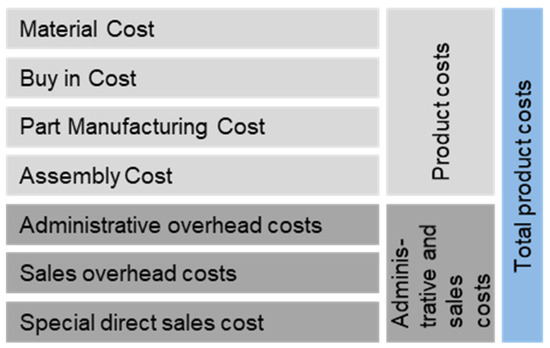 Normally, the total product costs are an aggregation of the product cost, as well as the administrative and sales costs. For this contribution, the focus is on the product cost, which in turn is an aggregation of material cost, buy-in cost, part manufacturing cost, and assembly cost. These costs are influenced by the development of the product. The total product cost, as well as margins for the sale of the product, are out of scope for this contribution, as they are not directly influenced by the product development [17]. This aggregation is shown in Figure 1.