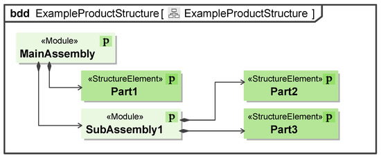In the motego method, the physical elements are represented by the stereotypes «StructureElement» and «Module» for parts and assemblies, respectively. These stereotypes are derived from the stereotype «Block» of SysML. For representing an assembly structure, the respective blocks are connected by a directed composition. A generic example of this hierarchy is shown in Figure 3. The information from Table 1 is distributed over this hierarchy. As the elements are from the “product” section of the MBSE methodology, they have the symbol “P” in the corner of the block.