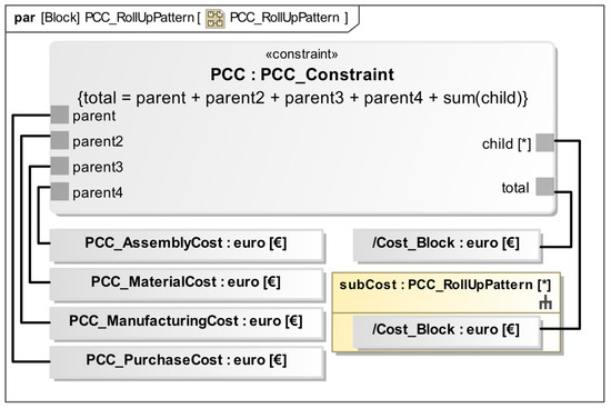 As the cost types derived are specific to an assembly or part (Table 1), the rollup pattern can only calculate a non-specific formula if all the cost types are given to every block part or assembly. This leads to a specific formula for a block given in Equation (2). This formula can then be put in the same scheme as Equation (1) and implemented into a rollup pattern in SysML.
