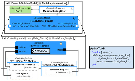 For an exemplary integration, the model of a simple time estimation is shown in Figure 7. In the upper part, the block definition diagram (bdd) gives the connection between the part, purpose, and model, with the used ports displayed in the model. In the internal block diagram (ibd) of the model, the constraint is displayed. The information for the model is passed from the «StructureElement» via full ports and flows into the constraint. The information is then passed to the MATLAB interface for Cameo Systems Modeler. The used MATLAB code is written in version R2023b also given in the third part of the figure. MATLAB is a platform for numerical calculation and programming [35]. It is chosen here, as it is widely spread for executing calculations and has a direct integration into CSM [35].