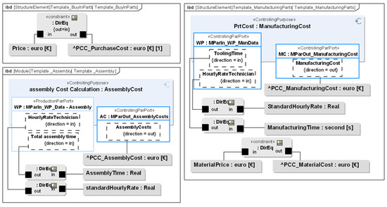 For the development of the given method, one goal is to derive a fast and efficient way to use the integrated cost models and rollup patterns. To achieve this, multiple templates were designed to model products in the system model. As in the method presented in this contribution, the product cost is calculated with the block for the part or assembly, the model purpose, and the already applied rollup pattern, the template should consist of these elements. The template is built for a buy-in part, a manufacturing part, and an assembly, respectively. The resulting templates are shown in Figure 8 as ibd.