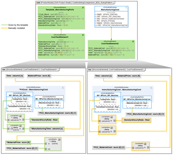 Secondly, the rollup pattern and the cost model library were then connected by the implementation of templates (3) for different types of parts. With these templates, the modeling effort for the use of the cost models was halved, based on the number of connections that need to be modeled for an element for which the cost is to be calculated.