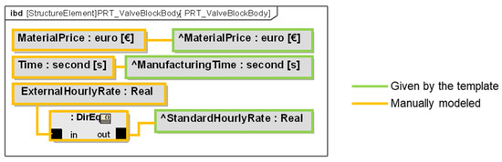 By using the templates, the modeling effort is reduced by around 20 s per part. For the cost modeling using the model HourlyRateSimple, the internal modeling of the valve block is shown in Figure 11. The values of the valve block parameters MaterialPrice and Time are given to the parameters ^MaterialPrice and ^ManufacturingTime from the template. In this example, it is also shown how to use a different value than the standard in the parameter. Here, the ^standardHourlyRate is overwritten by an external Hourly Rate, by a constraint. The modeling for the other parts happens accordingly.