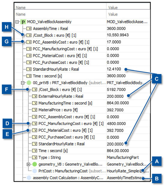 For the PRT_ValveBlockBody, the cost model calculates the manufacturing cost to 4800.00 € (D), the material cost for the valve block is 392.70 € (E). As such, the rollup pattern calculates, like in Equation (3), the/Cost_Block to 5192.70 € (F). For the PRT_Valve_3_EMP shown in Figure 10, the/Cost_Block is the external price. For the MOD_ValveBlockAssembly, the cost model calculates an assembly cost of 17.00 € (G). The value for/Cost_Block of the valve block assembly is the sum of every parameter/Cost_Block of its children, e.g., the two valves and the PRT_ValveBlockBody. The resulting calculation gives a cost of 10,550.99 € (H) for the MOD_ValveBlockAssembly. The valve block itself makes up around half of these costs.