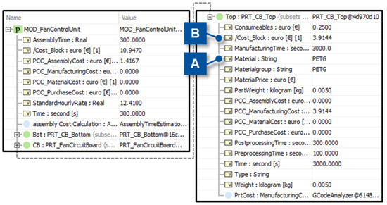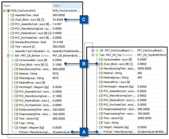 For the first scenario, the model 3DPrintCost_Simple is changed to the model GCodeAnalyzer. For this, the last field (Figure 13, F) of the two columns needs to be changed to the respective model, which is already implemented into the template. Changing the Field is conducted by a right click and adding the model. When simulating again, the new model is used. The first model can calculate a price based on an estimated time value, the material, and the estimated weight of the part. The second, more detailed model will take the necessary information from the machine code for the 3D printer (GCODE) that is used to manufacture the part itself, and considers the pre- and post-processing times for the manufacturing. The results of this detailed calculation are shown in Figure 14. Here, the PRT_FanCircuitBoard is not extended, as it stays the same during the changes in the scenarios. In Figure 14, the model changed to the more detailed model. At Figure 14, B consequently the cost for the parts has changed, and the parameter/Cost_Block at Figure 14, C. Due to the change in model granularity, the cost differs between before (5.7336 €, Figure 13) and after (10.9328 €, Figure 14, C).