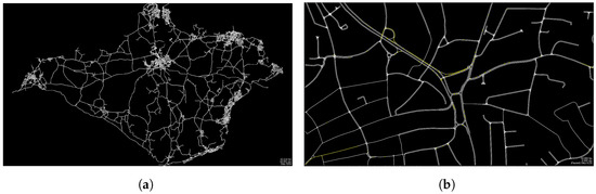 The Isle of Wight road network as modelled in the proposed simulation configuration, alongside a depiction of simulated traffic within the Newport area. (a) The Isle of Wight’s street network. (b) Traffic simulation at various junctions.