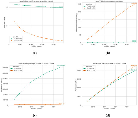 Benchmark results illustrating performance metrics for both the proposed traffic simulation and SUMO conducted on the Isle of Wight. (a) Real-time factor compared with vehicles loaded into simulation. (b) Average simulation runtime in seconds compared with vehicles loaded. (c) Simulation state change per second compared with vehicles loaded. (d) Number of vehicles inserted into the model compared with vehicles loaded.