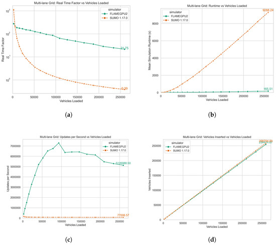 Benchmark results illustrating performance metrics for both the proposed traffic simulation and SUMO, conducted over a synthetic multilane grid. (a) Real-time factor compared with vehicles loaded into simulation. (b) Average simulation runtime in seconds compared with vehicles loaded. (c) Simulation state-change per second compared with vehicles loaded. (d) Number of vehicles inserted into the model compared with vehicles loaded.